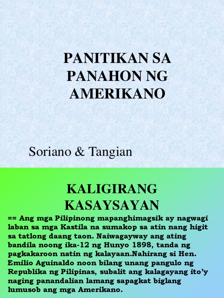 Pinatutunayan ng may-akda na hanggang sa kasalukuyan ang pagpapahalaga sa sa anumang bagay na dayuhan o ang tinatawag na Colonial Mentality ay patuloy na pinapahalagahan ng ng mga Pilipino at nagiging sagabal sa pagtatamo natin ng ganap na kalayaan. Panahon ng Amerikano. Peace and Order Kapayapaan Land Reform Reporma sa Lupa Economic Reform Repormang Pangkabuhayan Development of Moral Values Paglinang ng.