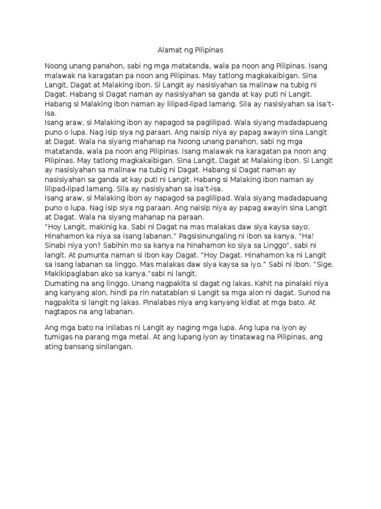 Mito Alamat Kuwentong-bayan Wika. 28072018 Ang Pinagmulan ng Lahing Kayumanggi Ang Amang Diyos nang bagong lalang ang mundo ay malulungkutin. Ibigay ang pinakamabisang diyalogo bilang wakas ng salaysay.
