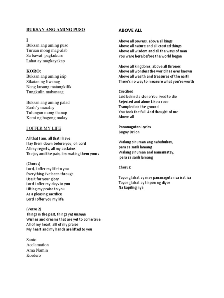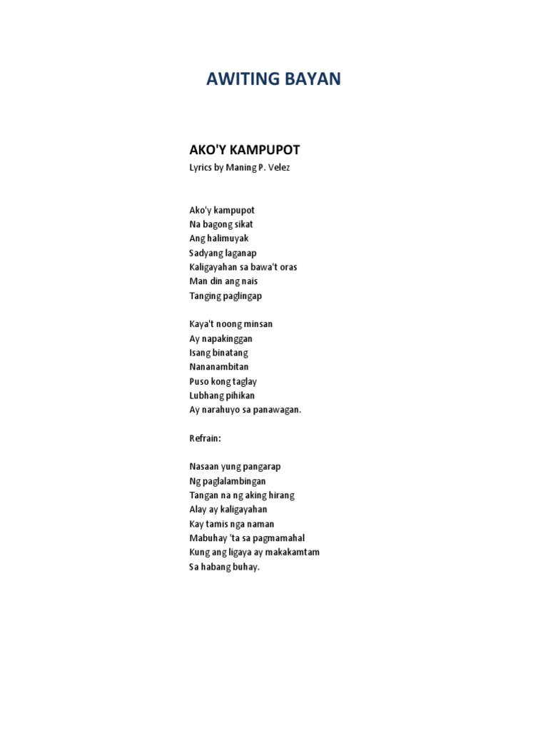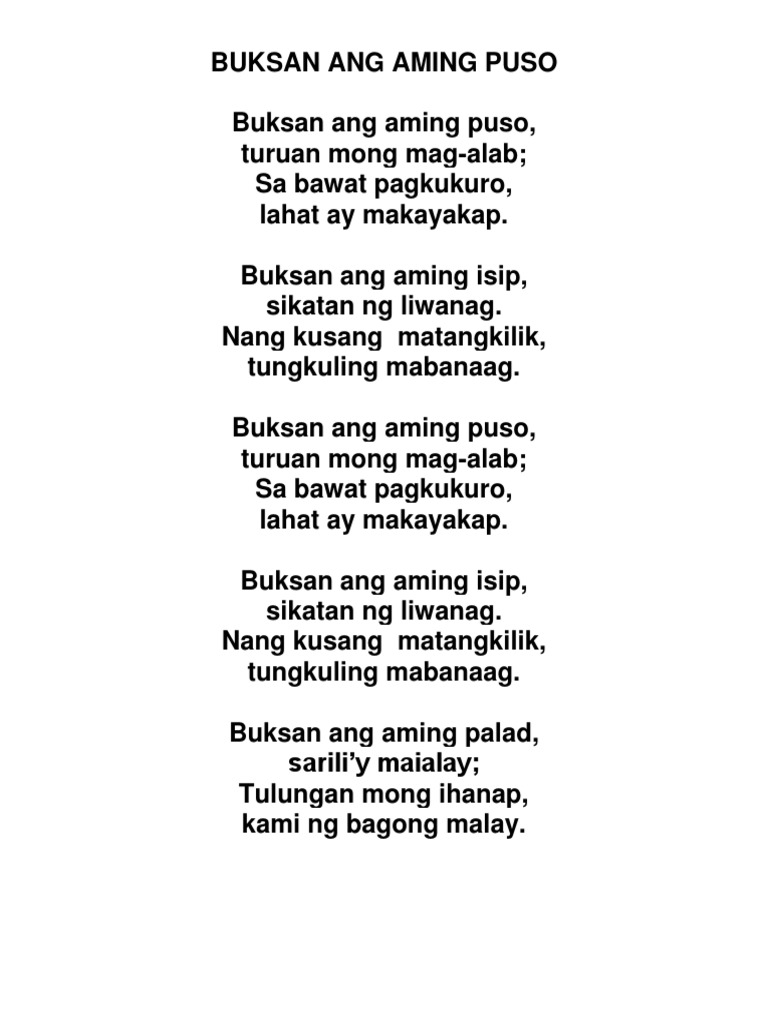 Likhaan Mo ng bagong puso Ang Iyong anak Upang Sayo ay magpuri Nang may kagalakan. Sa Pilipinas na bayang ating sinilangan. Chorus Bagong Pilipino ang tawag sa akin.