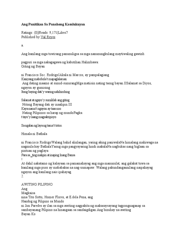 2192020 Sa harap ng ganitong pag-asam inilunsad ang bagong palatuntunan ng pamahalaan ang simulaing sang Bansa Isang Diwa. Ibat Ibang Panahon ng Panitikang Pilipino Kasaysayan ng Panitikan sa Pilipinas. SANAYSAY Maging sa mga sanaysay damang-dama ang labis na katuwaan ng mga Pilipinosa nakamit sa bagong kalayaan.